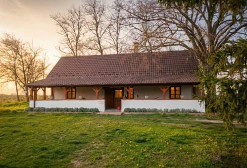 A terv egy kényelmes, 3 méter széles terasz volt, ami a ház teljes hosszában végigfut. Ez a méret már lehetővé teszi, hogy ne csak közlekedjünk rajta, hanem egy nagyobb asztal is kényelmesen elférjen itt, ahol az egész család le tud ülni a vendégekkel együtt jó időben, mivel a konyha nem elég nagy. Ehhez le kellett betonoznunk az alapot, majd felépítettük az új tornácfalakat a fa tartóoszlopok közé. A falakról kívül is levertük a régi tapasztott réteget, majd jött ismét a folyamat: nádazás, vakolás és a friss meszelés. A fehér fal és a cseresznyére lazúrozott fa szerkezet találkozása pontosan azt a vidéki eleganciát adta meg a háznak, amit elképzeltünk.