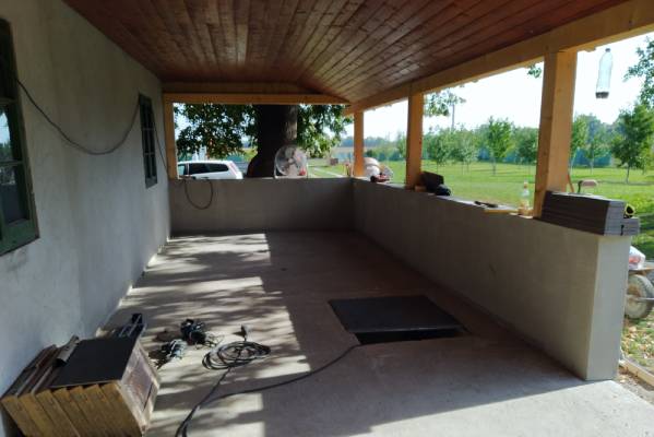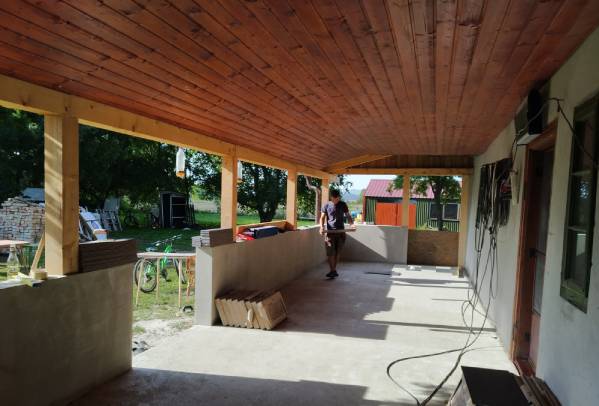 A ház előtt eredetileg is volt egy keskeny kis tornác, de a falai romosak voltak. Ezeket korábban lebontottuk, és a régi téglákat – az újrahasznosítás jegyében építettük be a falak lábazatába, kívül és belül egyaránt.